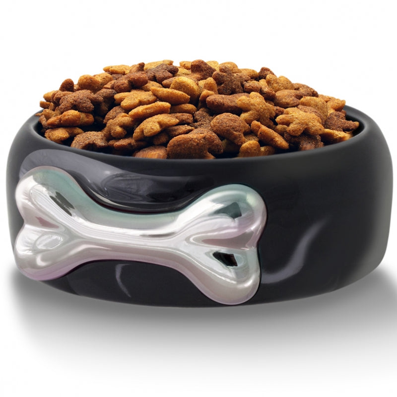 This black ceramic bowl sports a silver glazed dog bone for your pampered pooch.